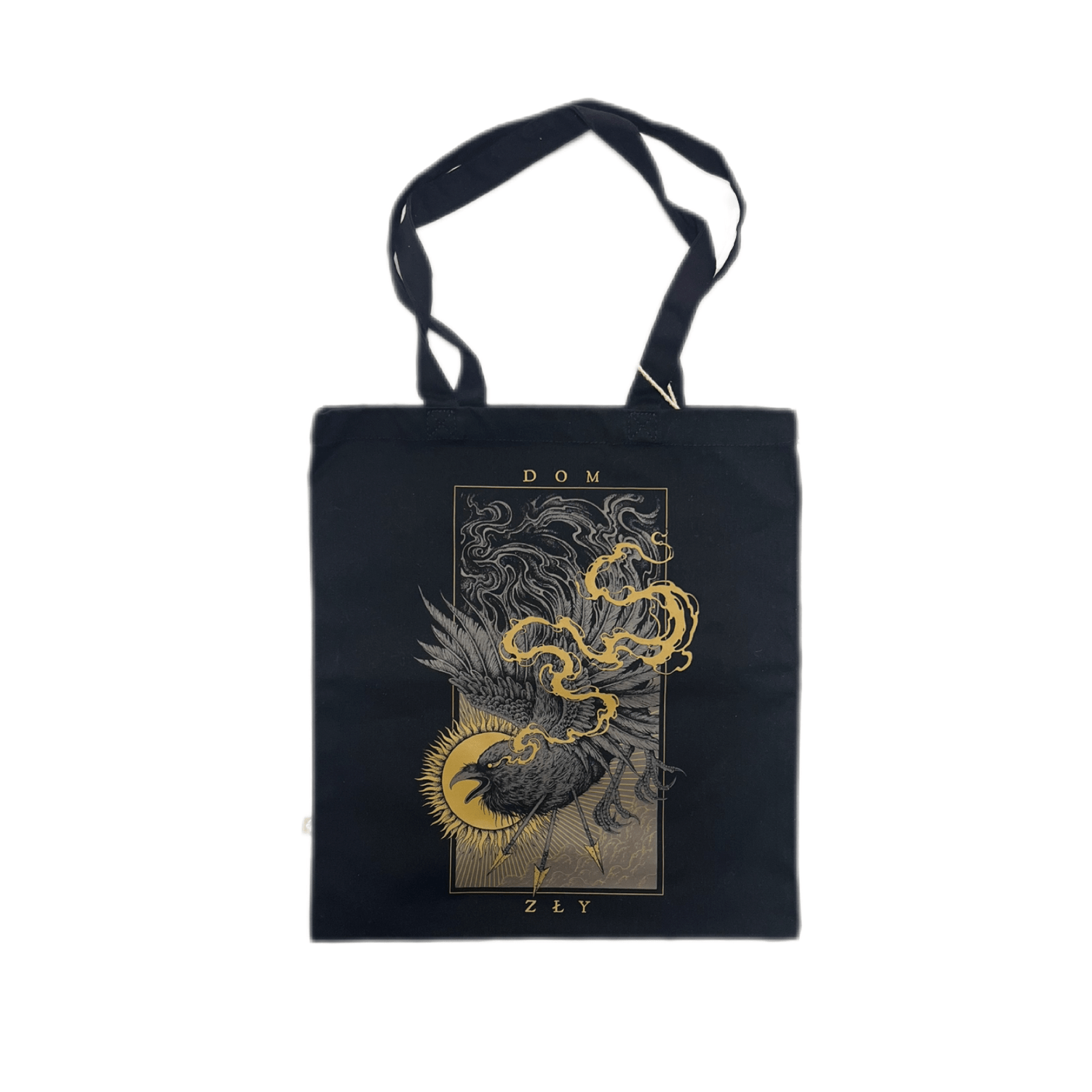 Torba Dom Zły – Czarny Ptak. Czarne płótno z wyrazistą złoto-szarą grafiką. Praktyczna, trwała, koncertowa i na co dzień.